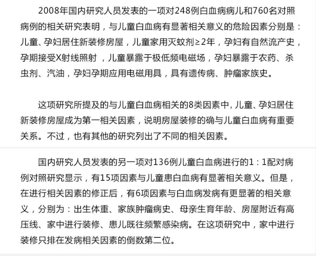 當(dāng)然,還有其他一些研究結(jié)果也與上述研究結(jié)果大同小異,其中家庭裝修與白血病相關(guān)是一個重要因素,而且大部分研究顯示,即便家庭裝修因素不排在***位,也排在前列。